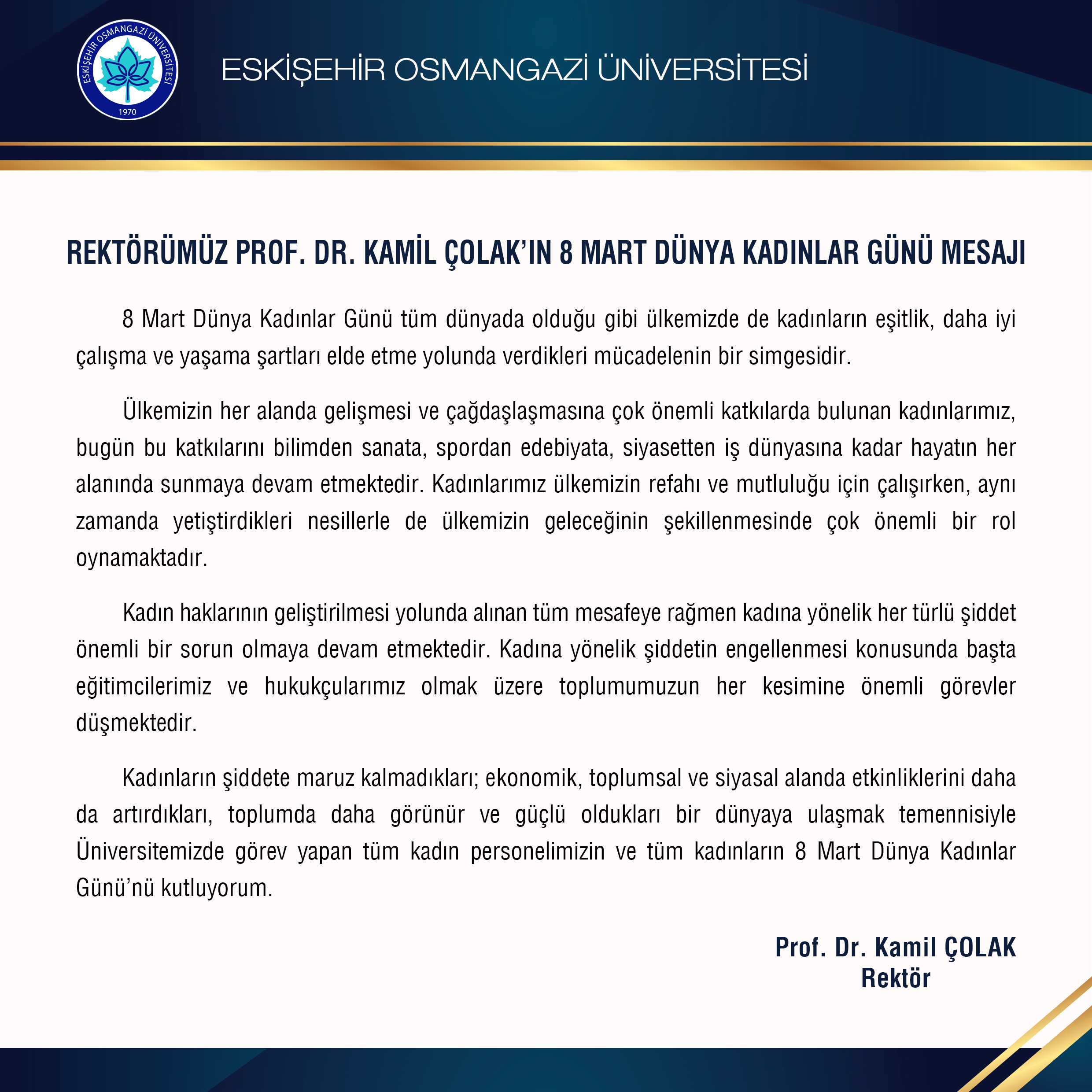 ESOGÜ Rektörü Prof. Dr. Kamil Çolak'ın 8 Mart Dünya Kadınlar Günü Mesajı