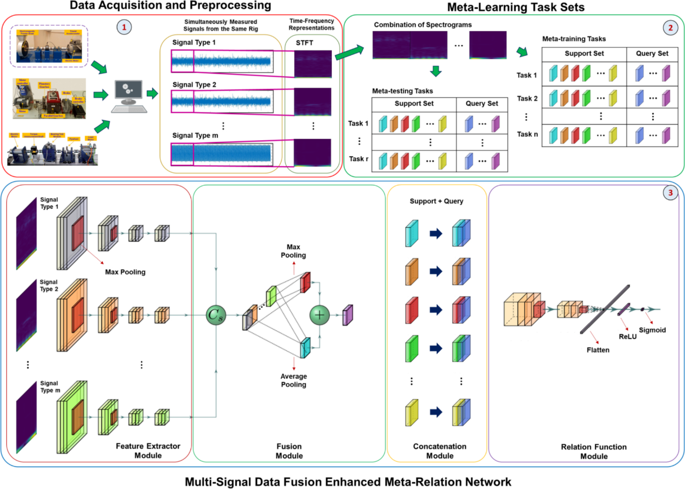 Önerilen yaklaşım, metrik tabanlı bir meta-öğrenme algoritması olan İlişki Ağlarını içermekte ve veri ön işleme süreçlerinde kısa zamanlı Fourier dönüşümünden (STFT) faydalanmaktadır. Ayrıca, gömülü temsillerin elde edilmesinde çok dallı ve özdeş öznitelik çıkarıcılardan oluşan bir mekanizmanın kullanıldığı bu yöntemde, çoklu sinyallerin kolaylıkla öznitelik seviyesinde birleştirilmesine olanak sağlayan özgün bir füzyon yaklaşımı tasarlanarak geliştirilmiştir. Meta-öğrenme yaklaşımının temel amacı, daha önce görülmemiş ancak ilişkili sınıfları az veriyle doğru şekilde teşhis etmek olduğundan, yapılan testler üç farklı kullanım senaryosuna göre gerçekleştirilmiştir: (1) benzer arızaların farklı seviyelerinin teşhisi, (2) aynı arıza türlerinin farklı çalışma koşullarında teşhisi ve (3) farklı arıza türlerinin teşhisi.