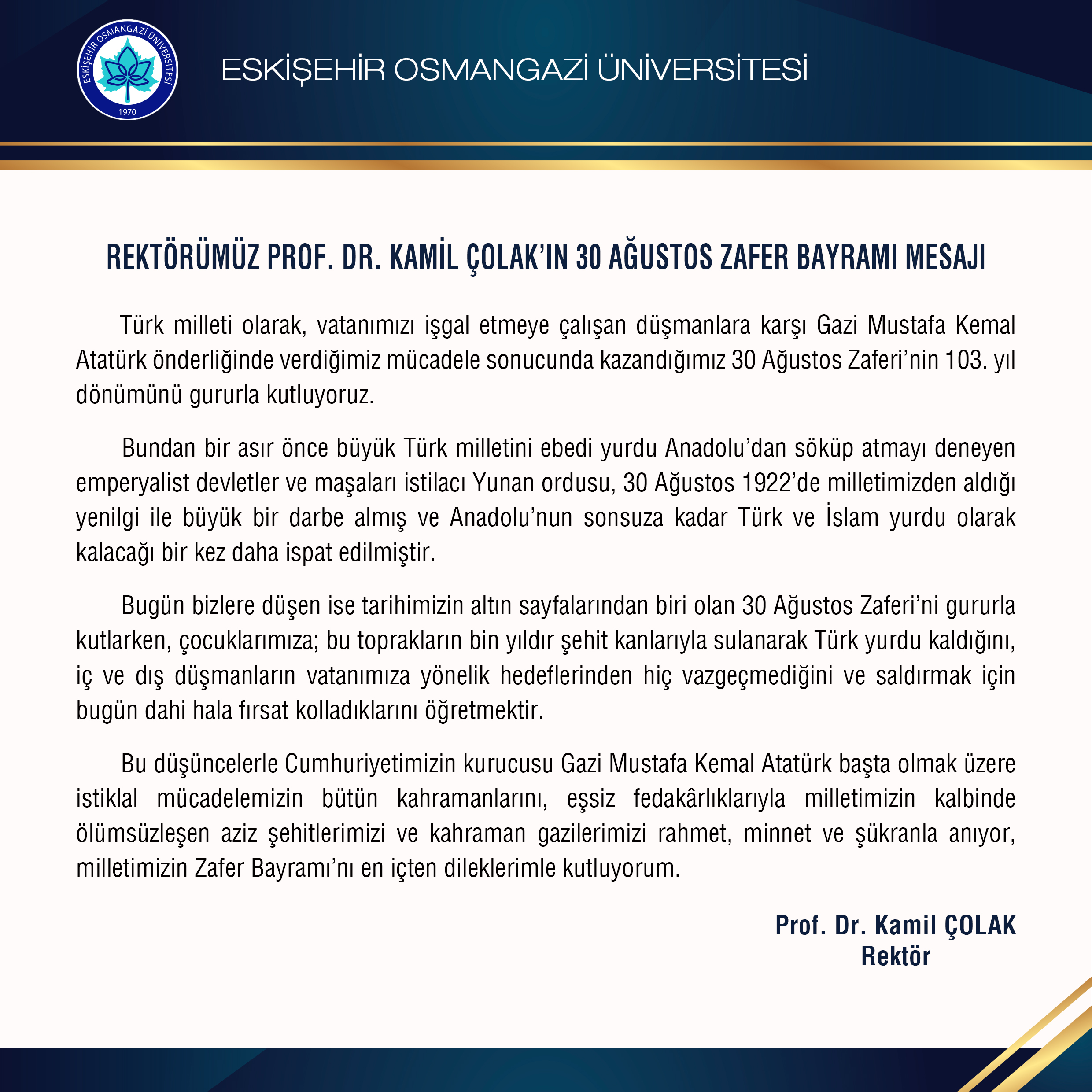 Rektörümüz Prof. Dr. Kamil Çolak’ın 30 Ağustos Zafer Bayramı Mesajı