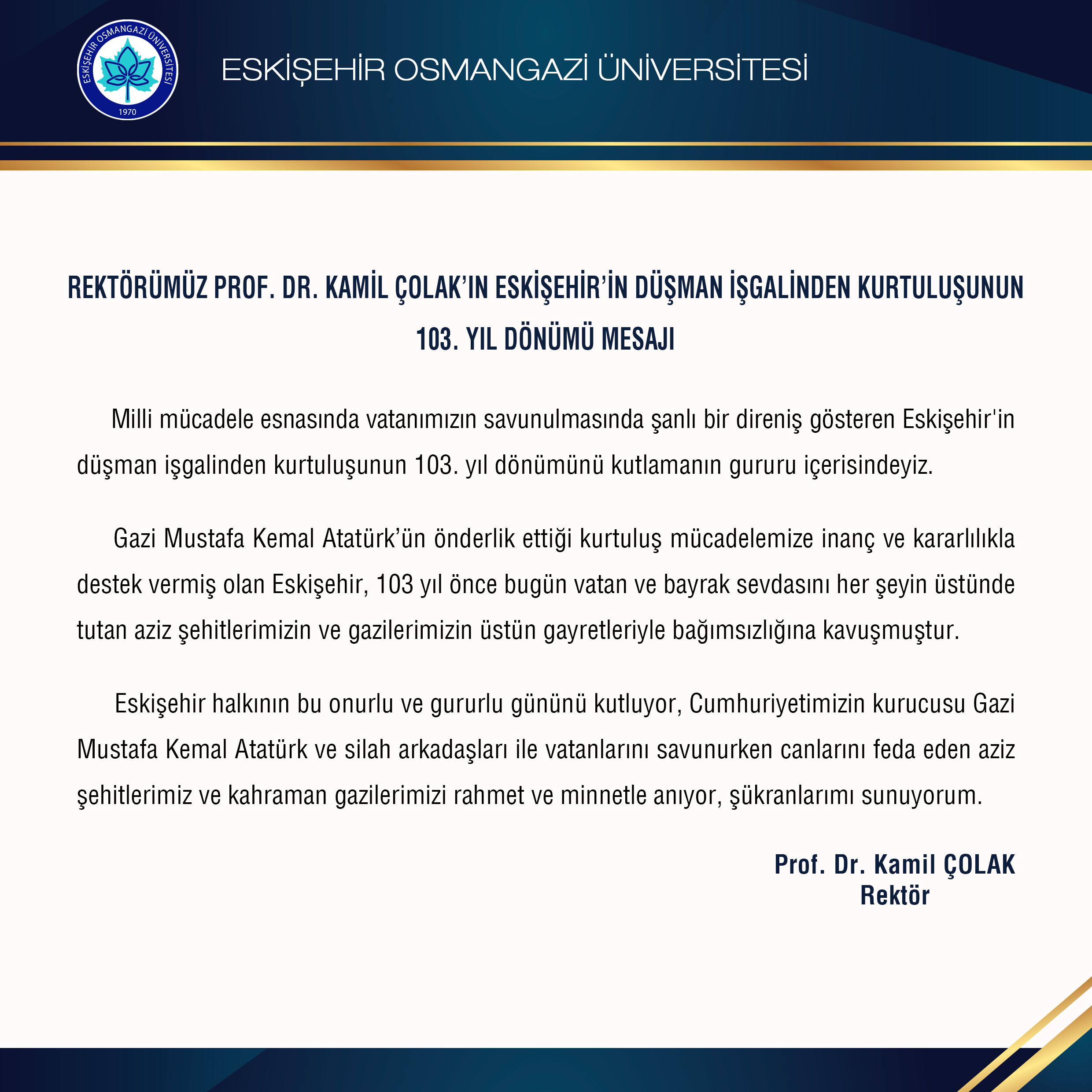 Rektörümüz Prof. Dr. Kamil Çolak’ın Eskişehir’in Düşman İşgalinden Kurtuluşunun 103. Yıl Dönümü Mesajı